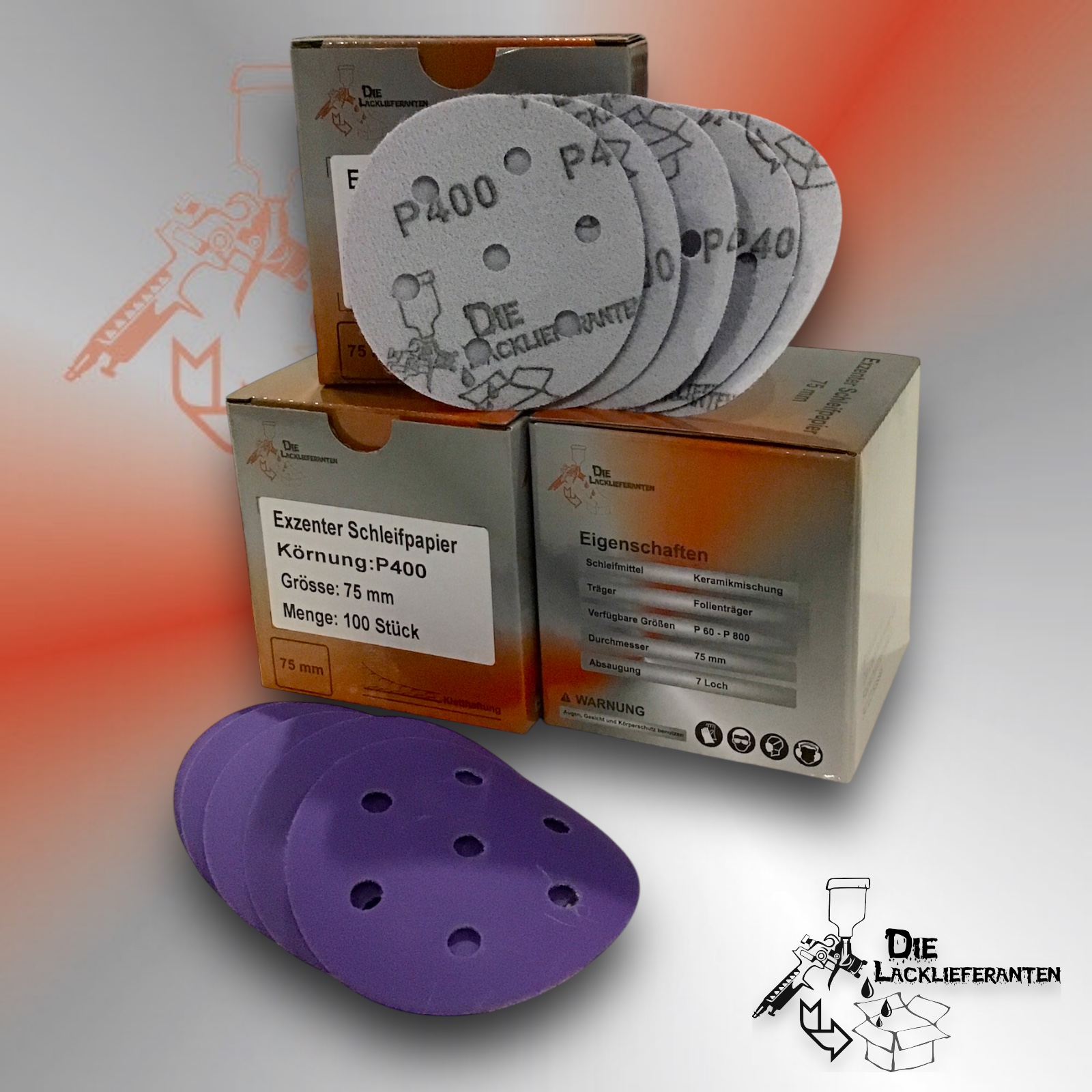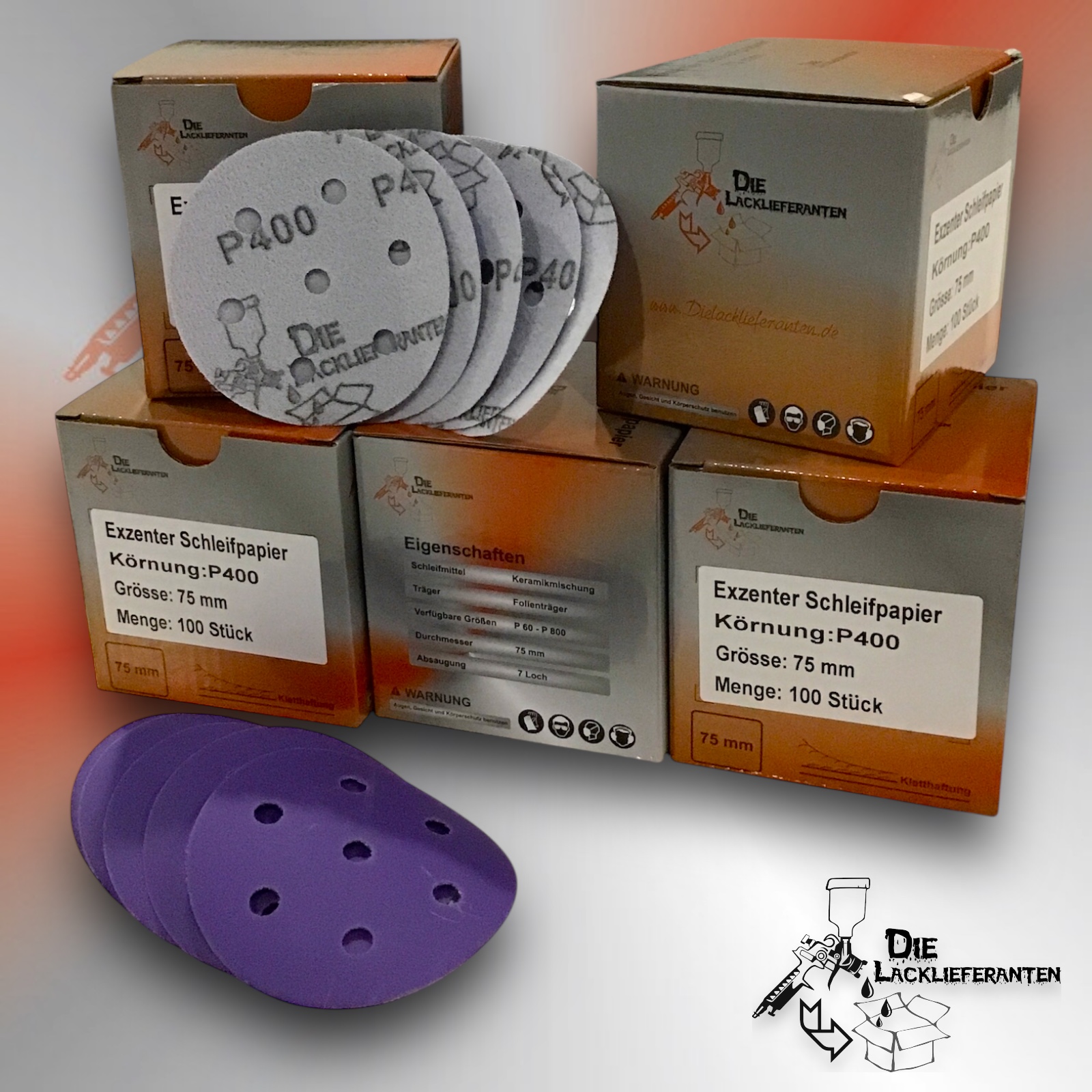 Enthält 20% MwSt.zzgl. Versand500X Exzenter Schleifpapier / Klett-Schleifscheibe P400 Ø 75mm Folienträger, 7 Loch Absaugung, Schleifkorn Keramikmischung #Q22T75P400